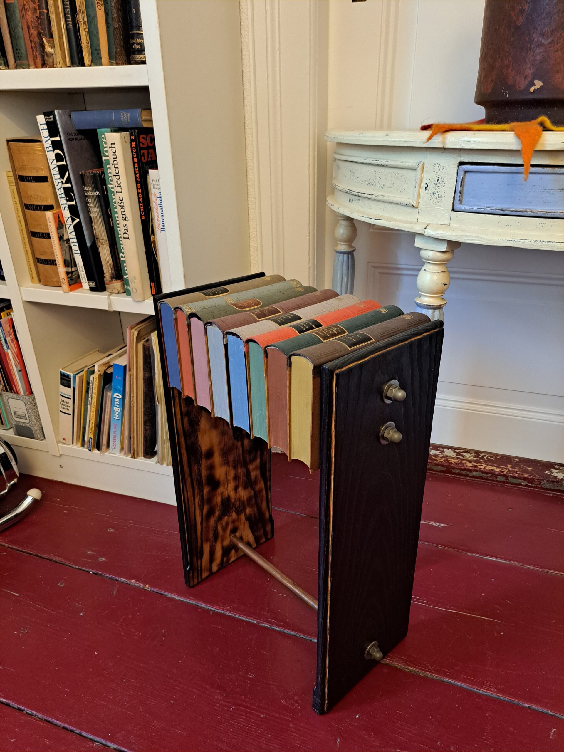 Ein echtes Unikat mit doppeltem Nutzen: Aus alten Büchern und edlem Holz entstand dieser charmante Hocker für Bibliophile mit Sinn für Design. Die Buchrücken sind original, die Konstruktion stabil – handgefertigt, abgeflammt, geschwärzt und mit Details aus Messing veredelt,die bücher sind durch eine spezial beschichtung konserviert und extrem abriebfest.