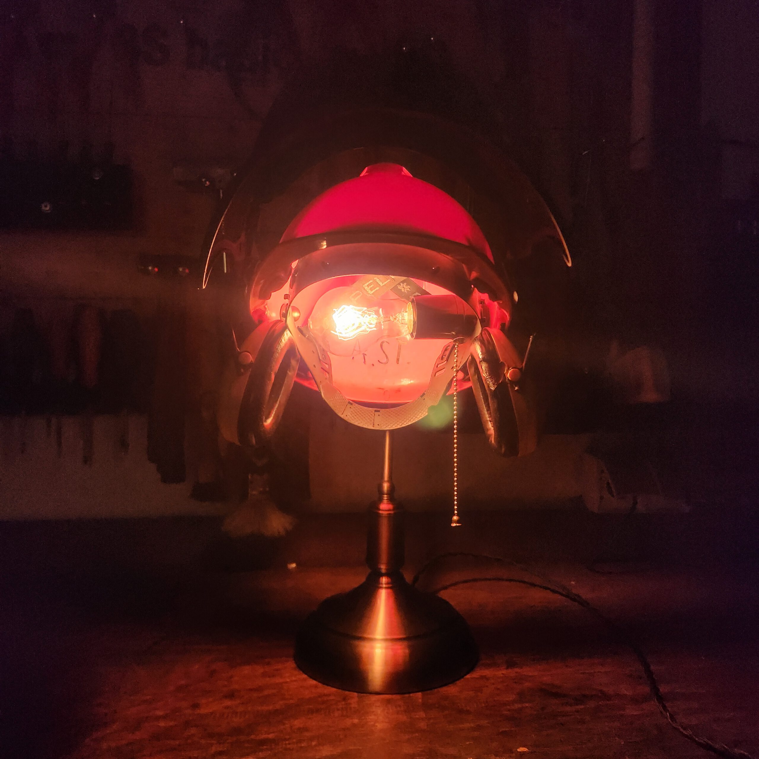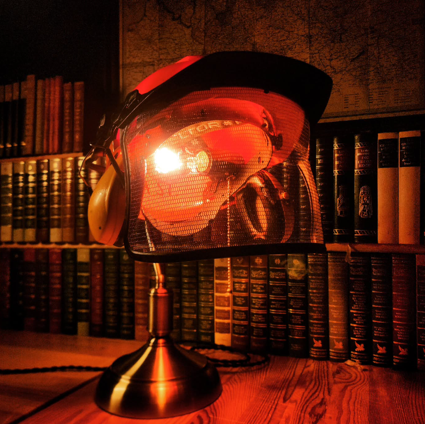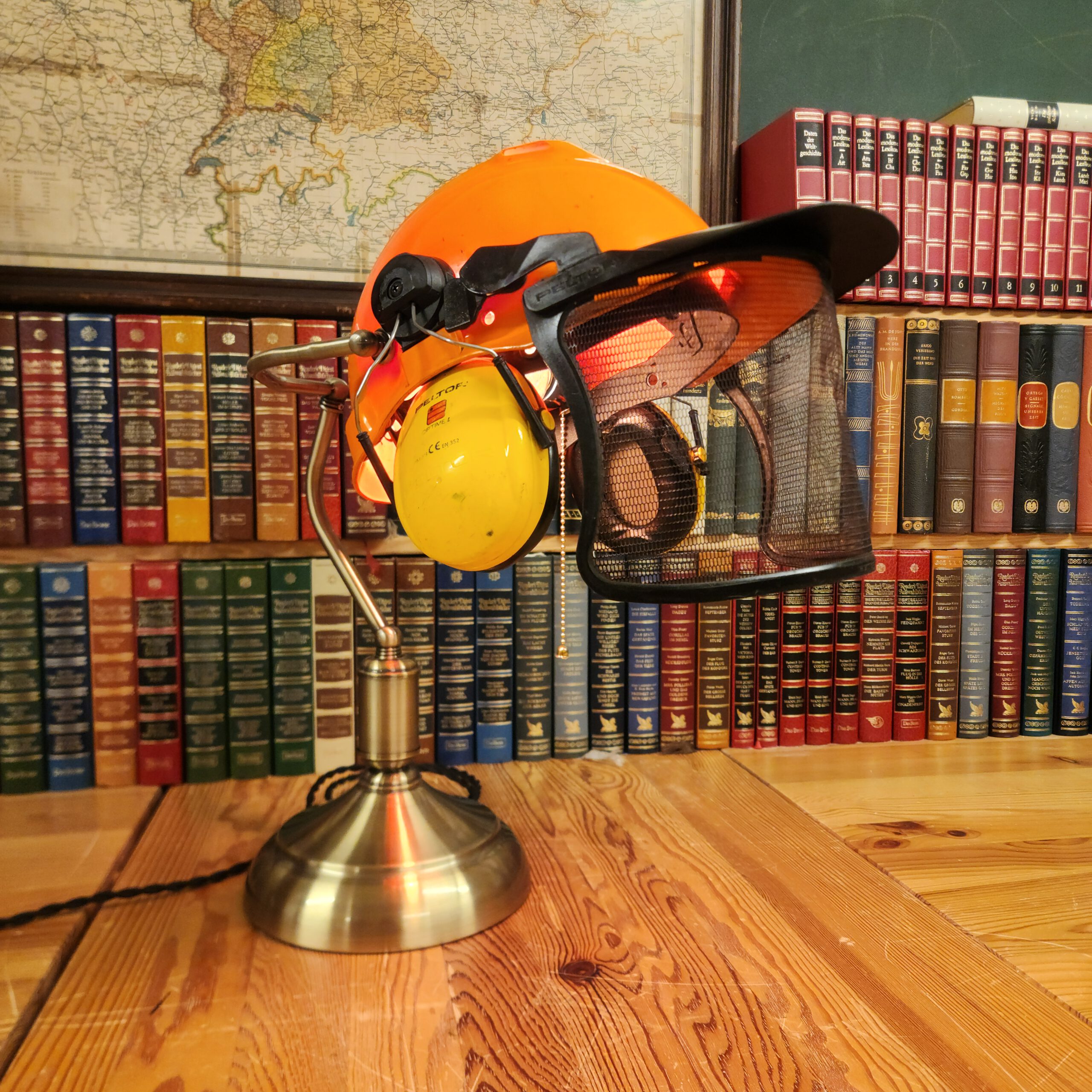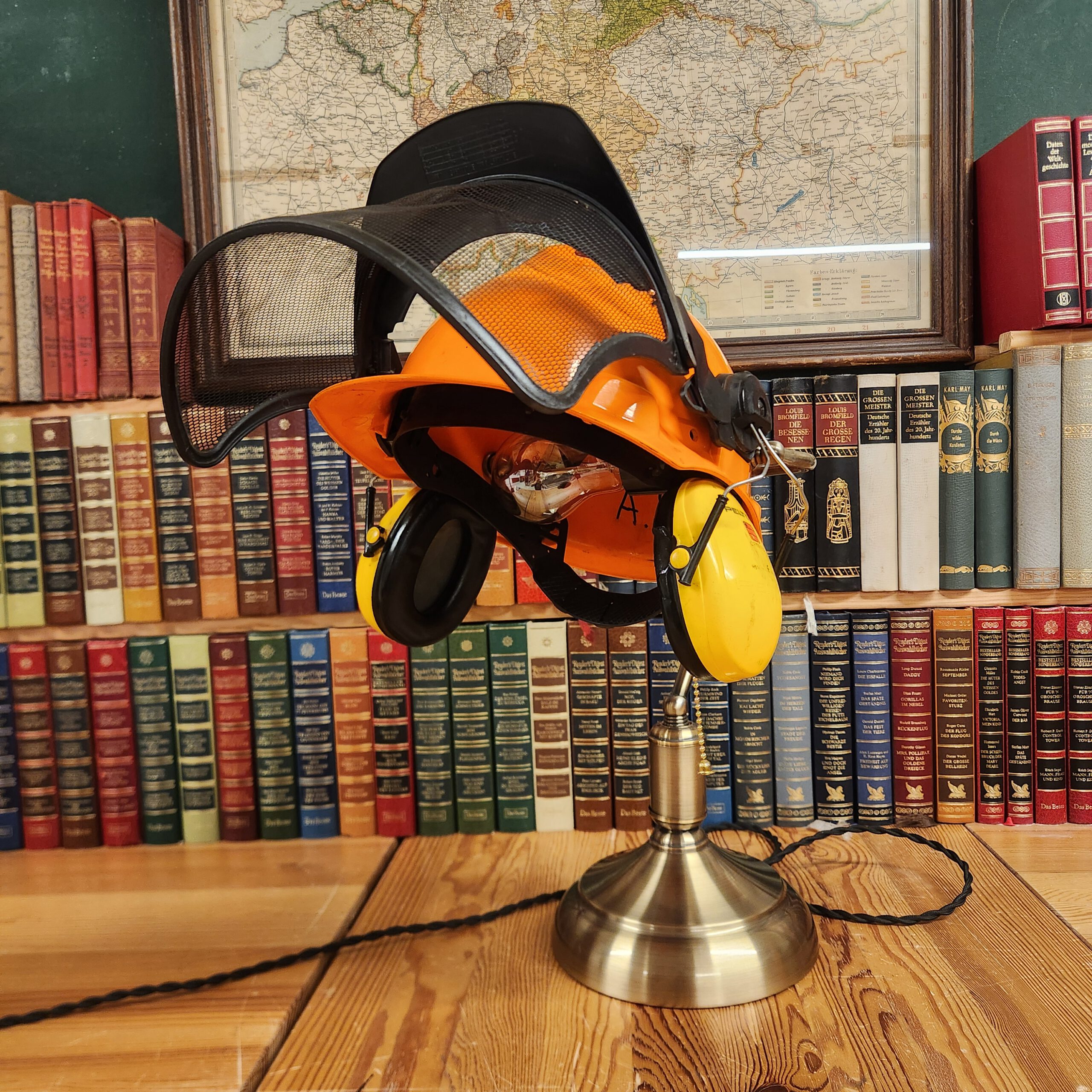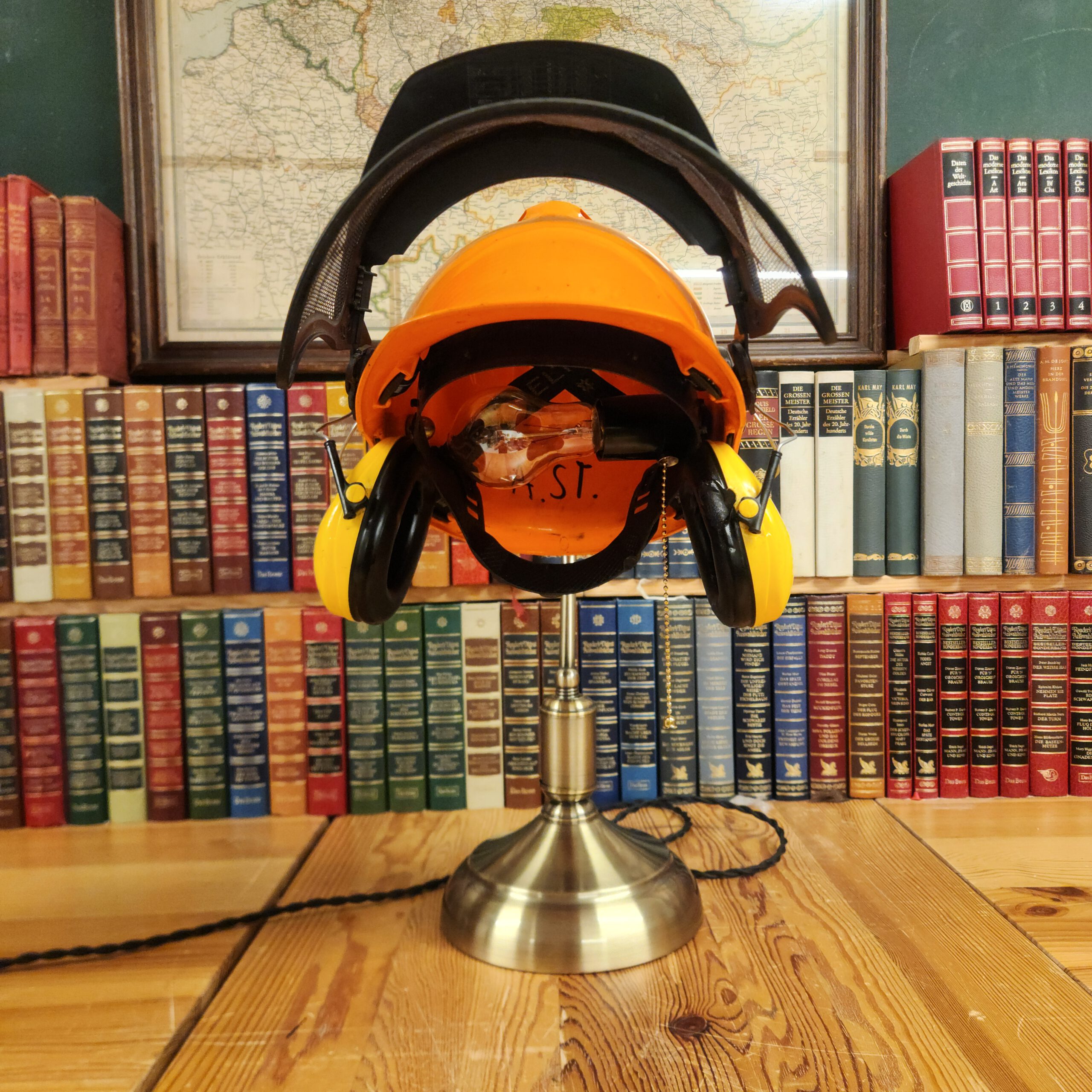 Aus einem alten Sägerhelm entstand diese besondere Heimleuchte – komplett zerlegt, gründlich gereinigt, geölt und liebevoll umgebaut. Jetzt sorgt statt Motorsound warmes Licht für Atmosphäre – stilecht durch das feine Visier.