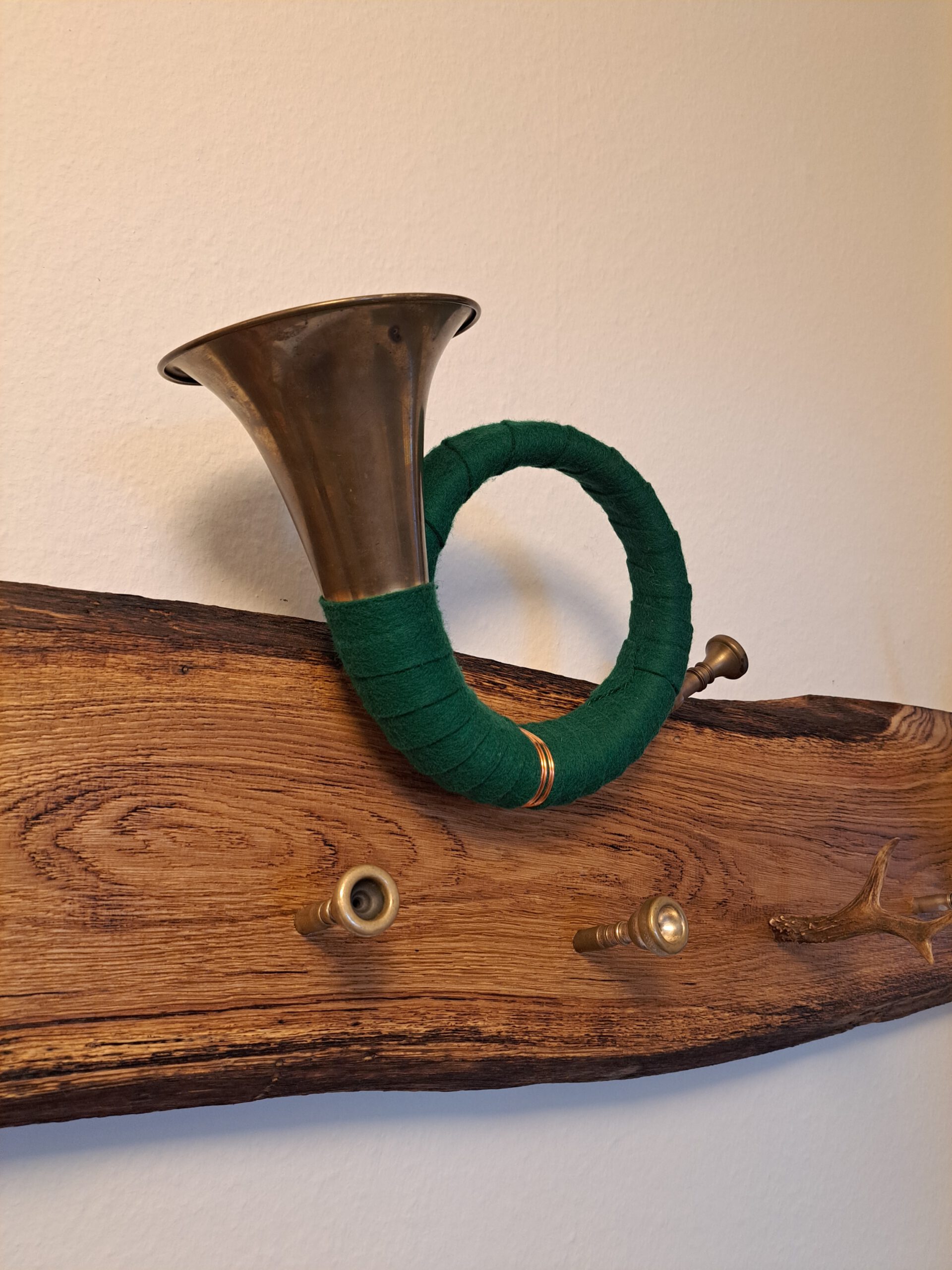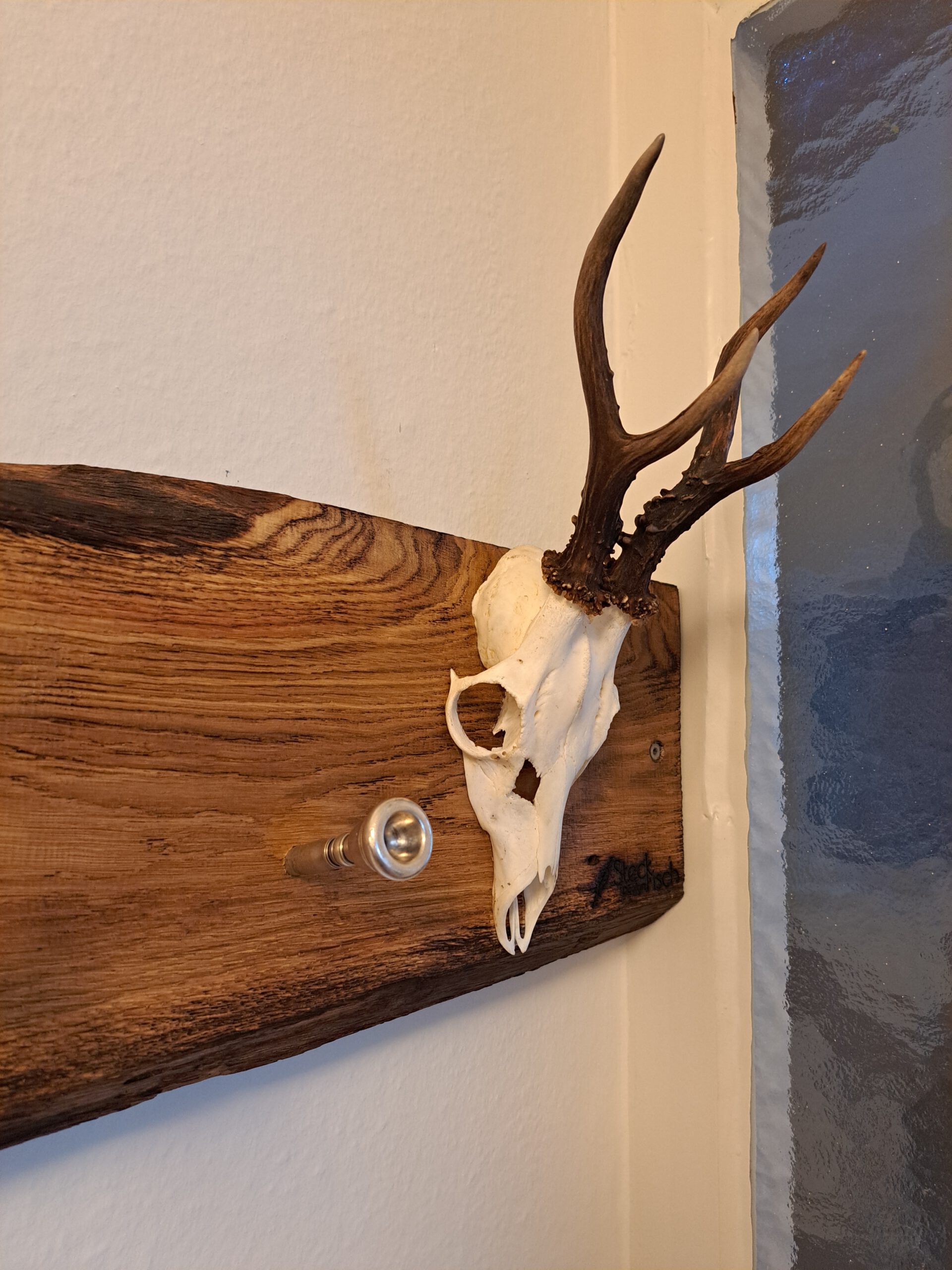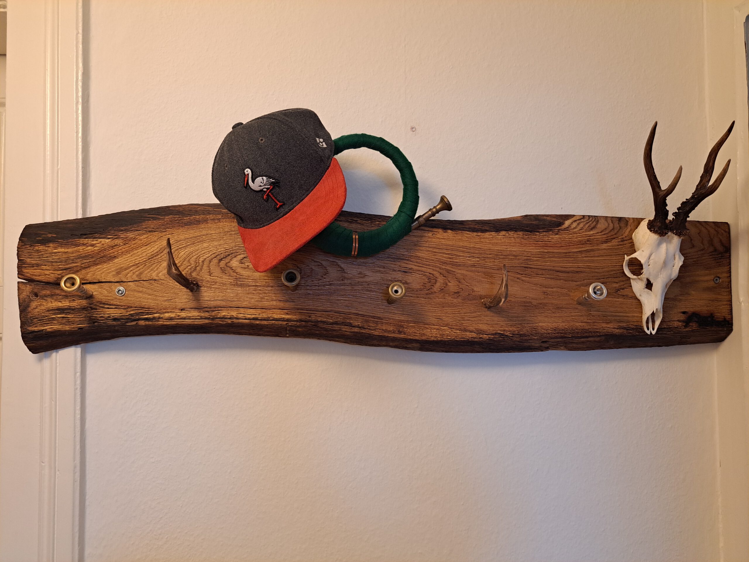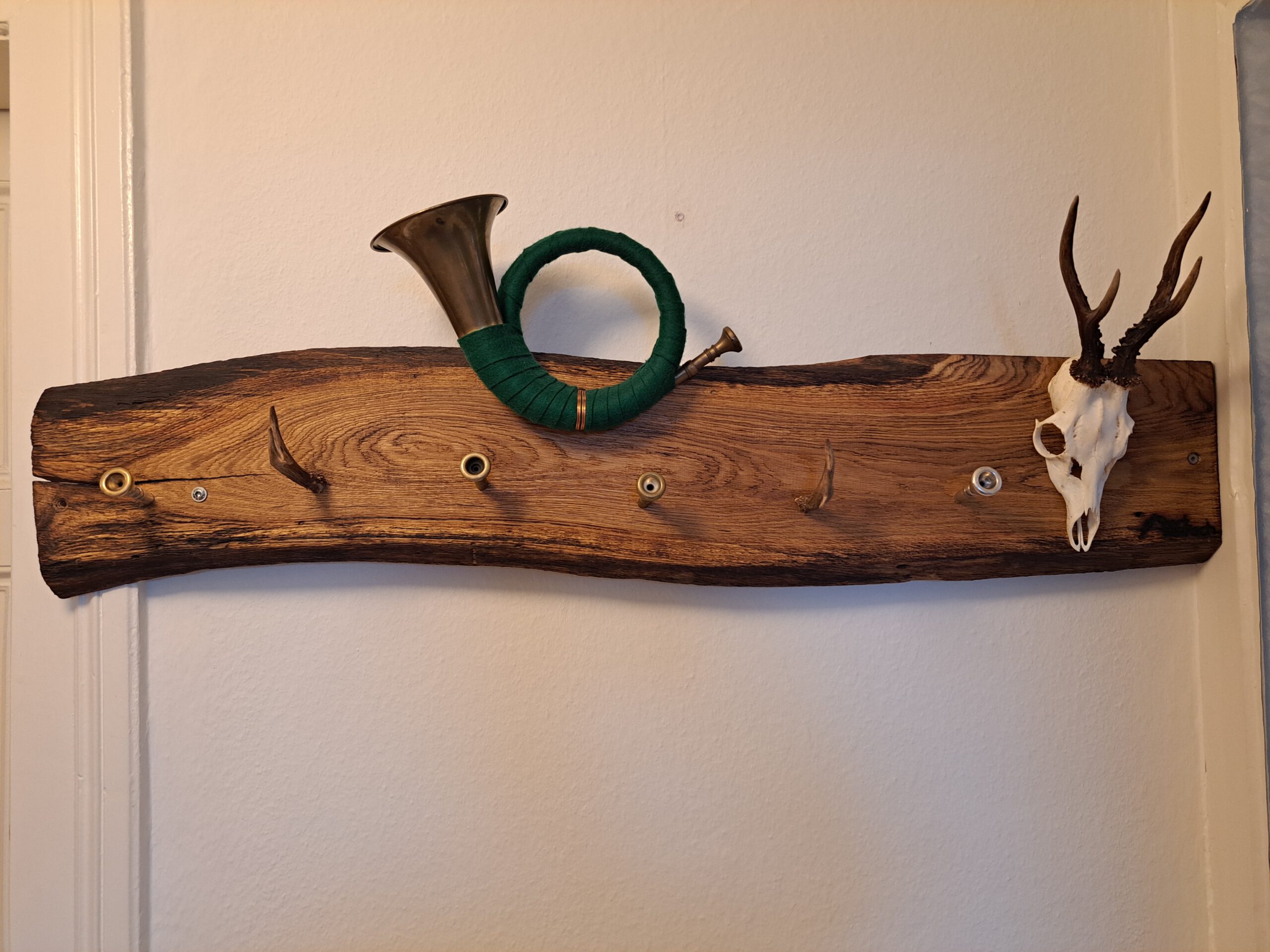 Aus einem massiven Holzbrett, kombiniert mit echten Geweihen, Horn und Fundstücken, entstand diese außergewöhnliche Garderobe.