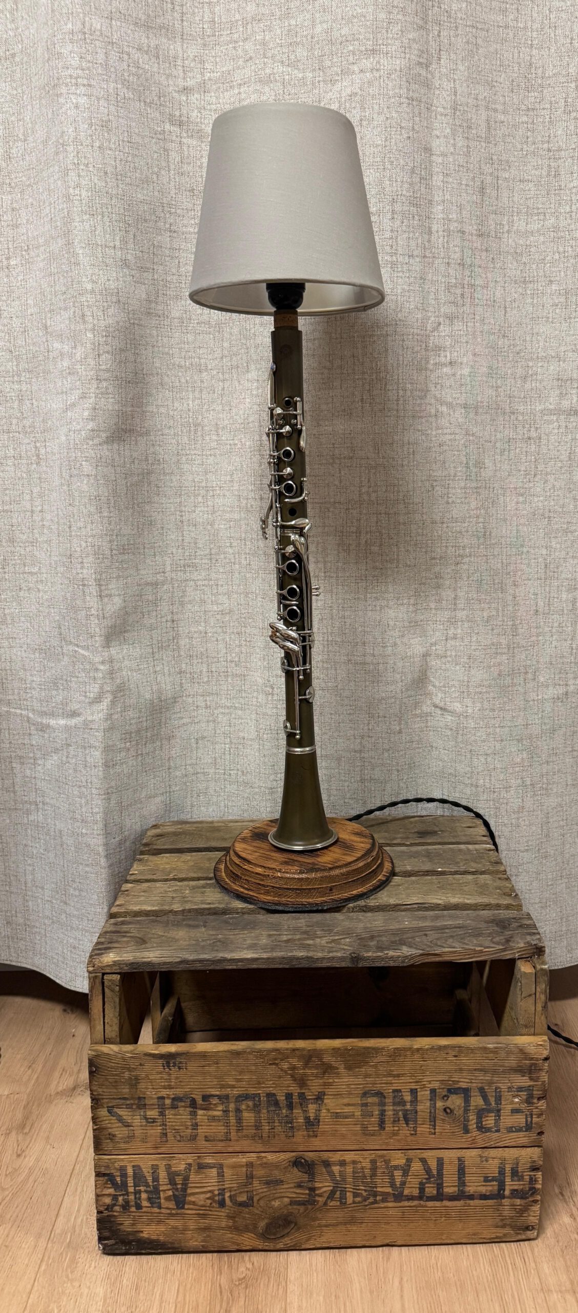 Für alle, die Musik nicht nur hören, sondern leben: Diese einzigartige Tischlampe wurde aus einer echten Klarinette gefertigt und in ein elegantes Lichtobjekt verwandelt. Die feinen Details der Mechanik, das grüne Holz und der warme Schirm machen sie zu einem ganz besonderen Hingucker – egal ob im Musikzimmer, Wohnzimmer oder kreativen Arbeitsraum.