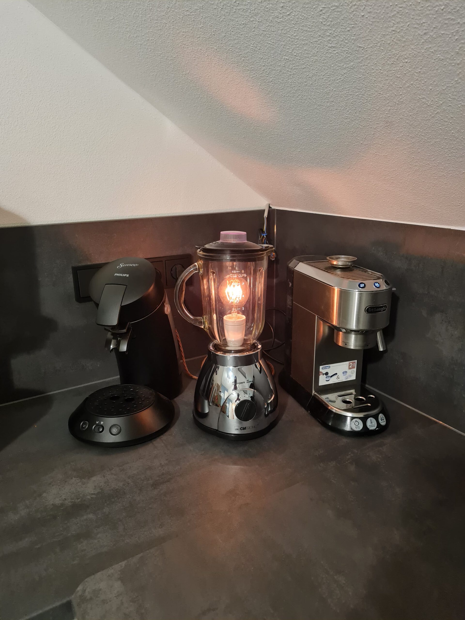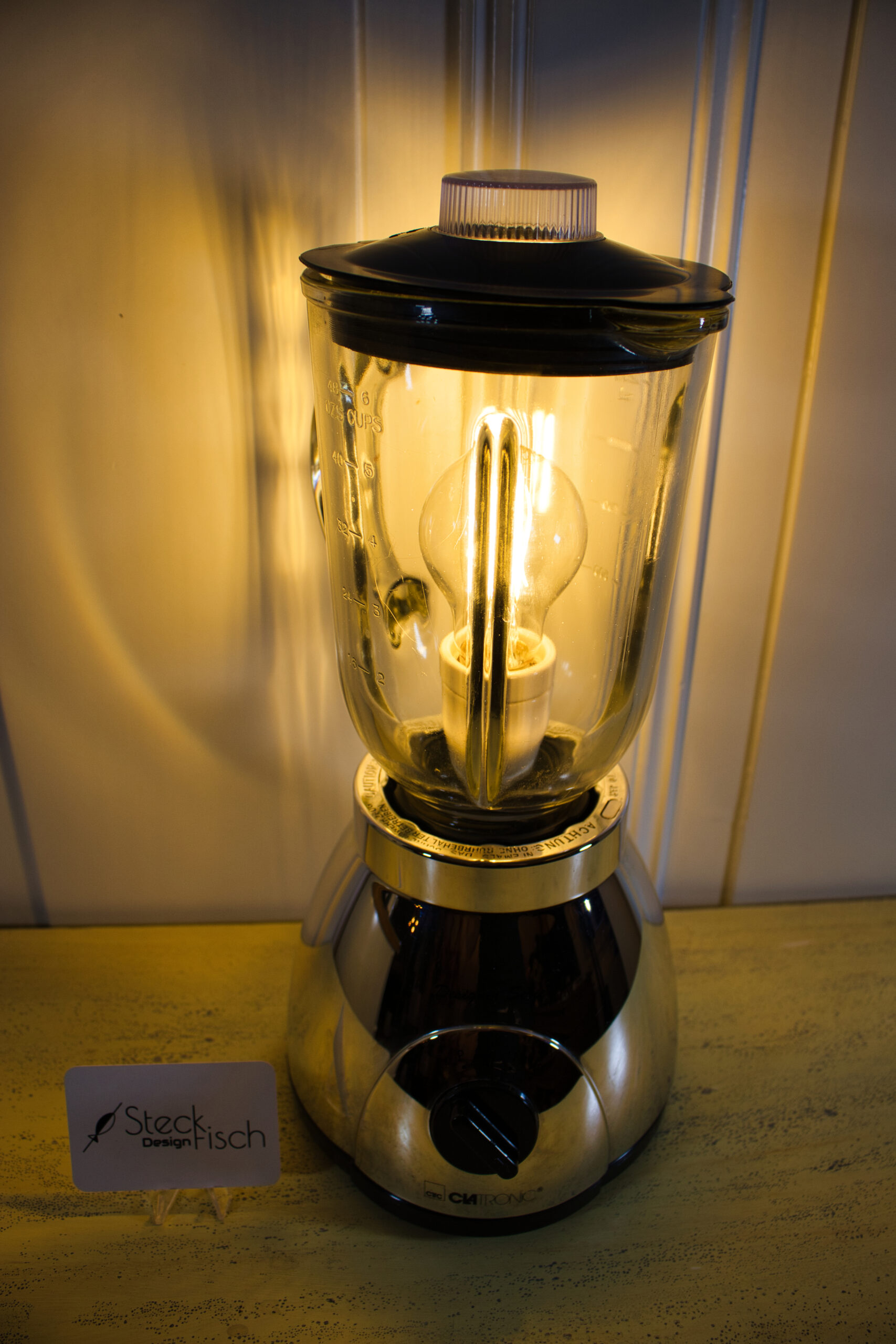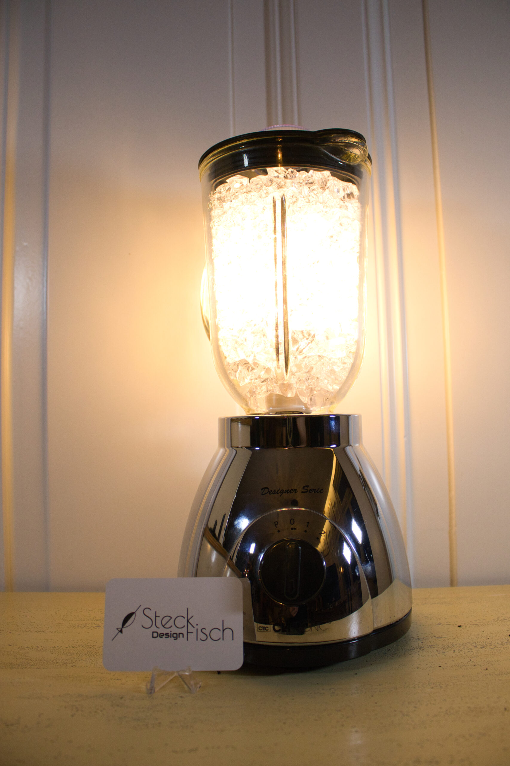 Aus einem klassischen Standmixer wird bei Steckfisch Design ein stylisches Lichtobjekt mit Augenzwinkern. Der Glaskrug ist gefüllt mit funkelnden Acrylsteinen, die im warmen Licht glitzern wie zerstoßene Eisdiamanten, den letzten Schliff verpasst der integrierte Dimmer.