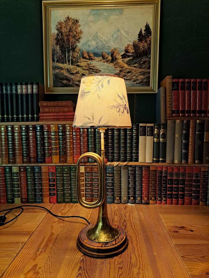 Diese besondere Nachttischlampe entstand aus einem echten historischen Blechblasinstrument, dessen warme Messingpatina bewusst erhalten blieb. Statt Töne zu formen, schenkt es nun ruhiges, stimmungsvolles Licht.