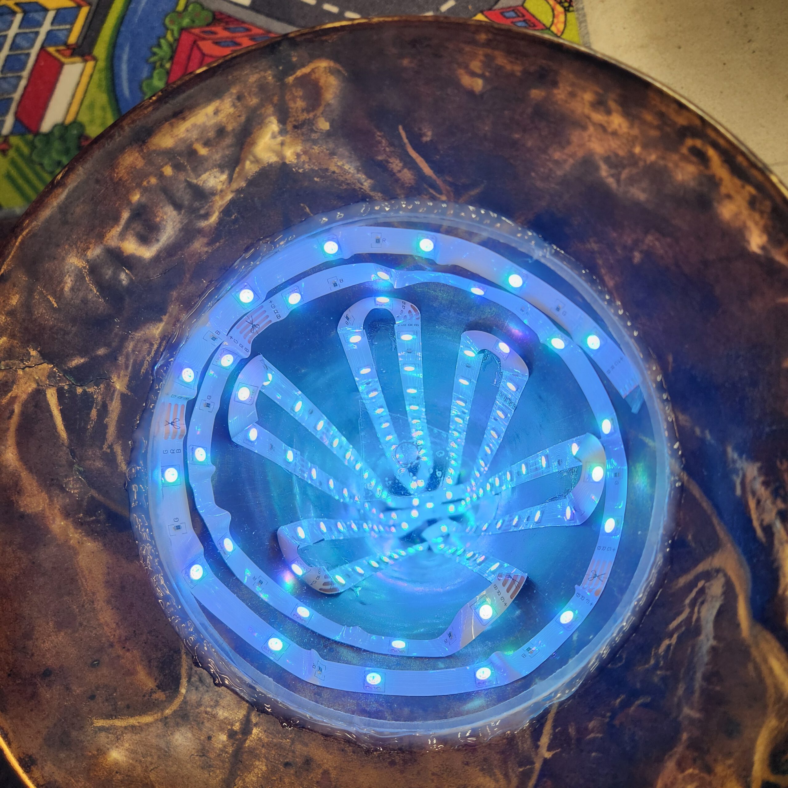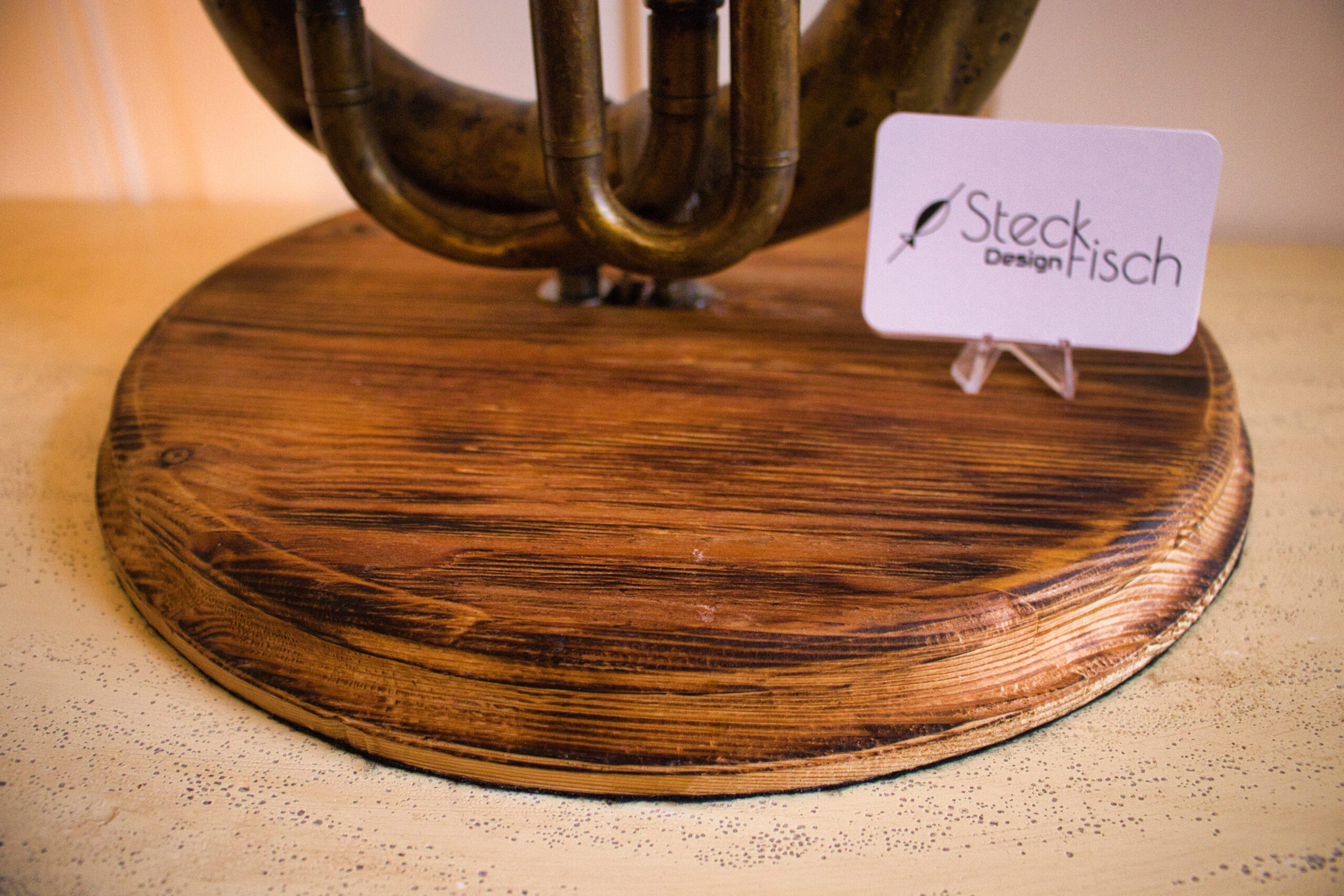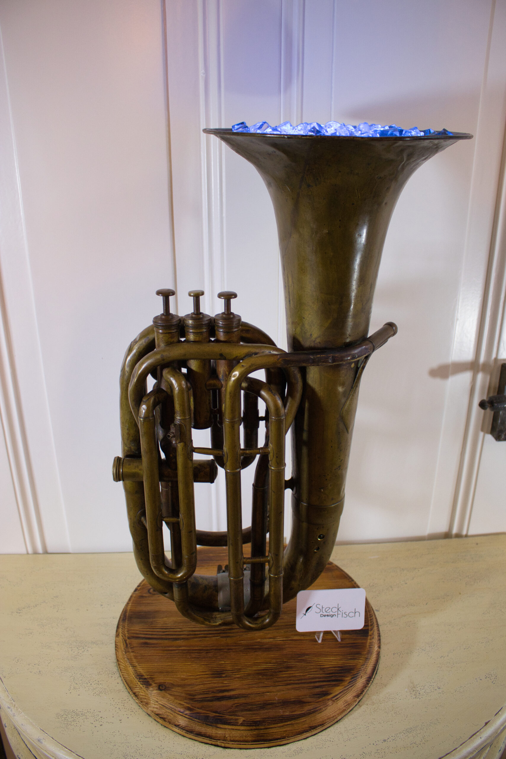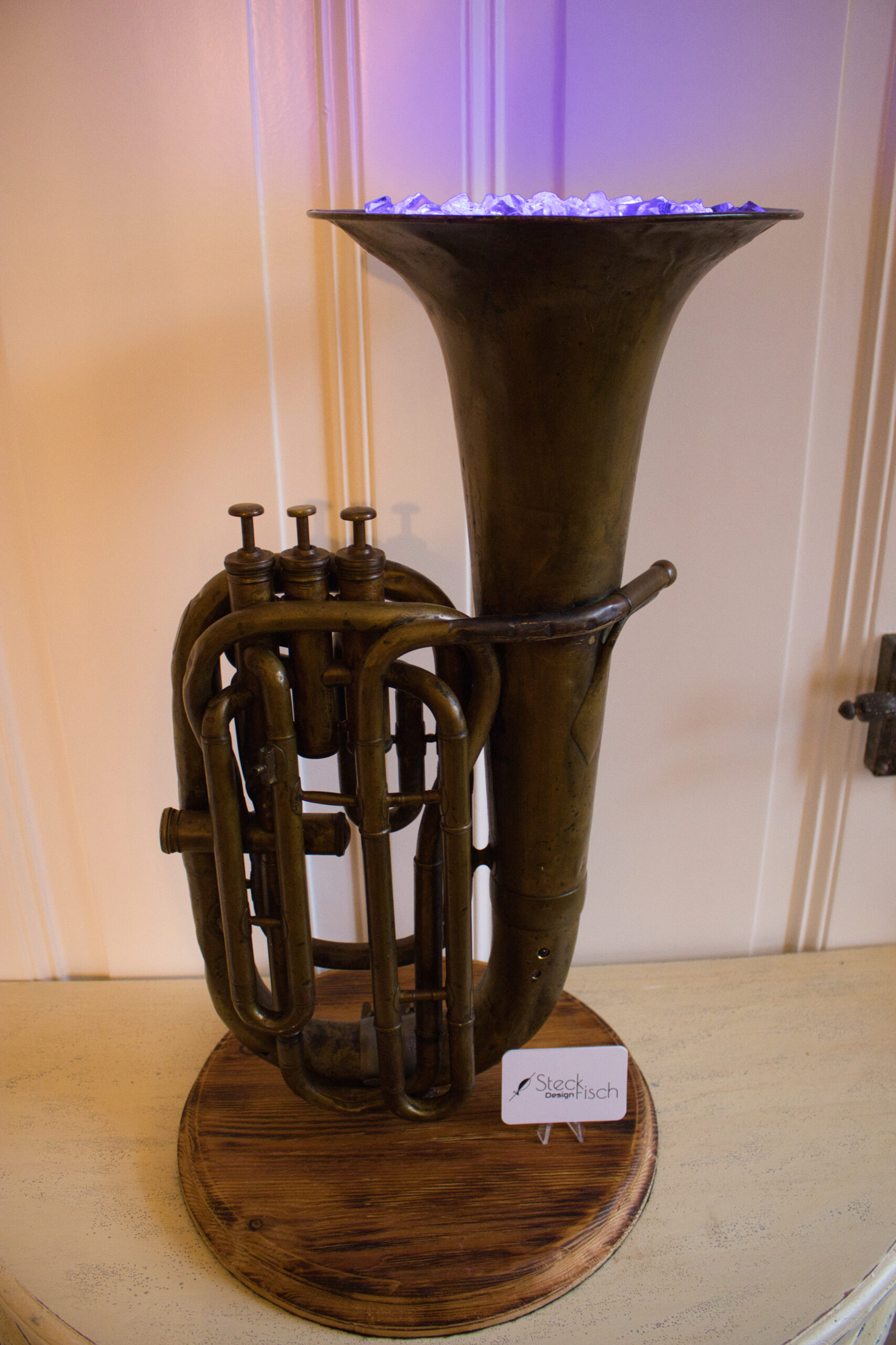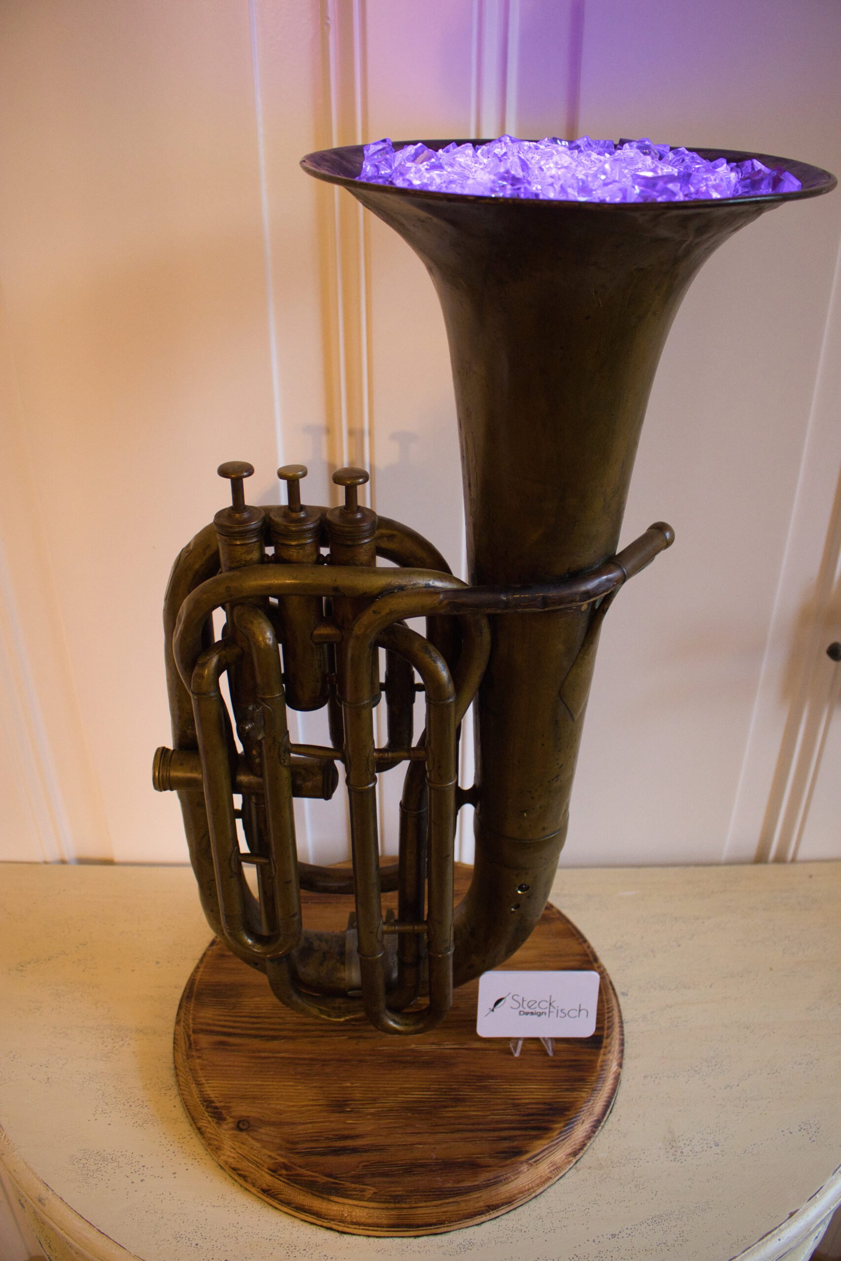 Dieses Mal wurde’s modern: Eine mobile LED-Beleuchtung mit Musiksteuerung bringt das alte Blasinstrument zum Leuchten. Gesteuert per Fernbedienung, versiegelt unter einem Deckel aus glasklarem Epoxidharz mit Kristalloptik – ein echtes Unikat mit Wow-Faktor.
